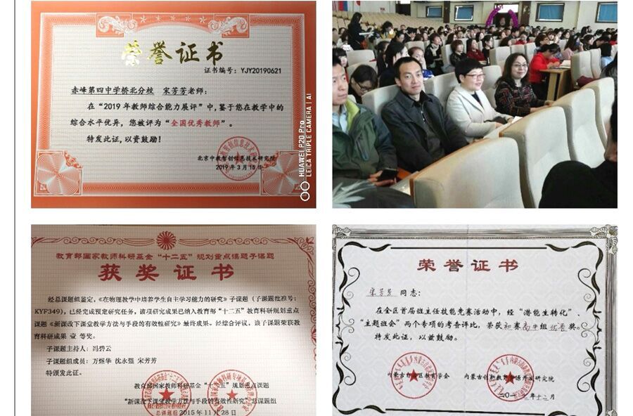 宋芳芳作为赤峰市红山区孙成文物理名师工作坊核心成员,除参与红山区大型考试命题外,还参与完成了赤峰市重点课题《高中物理教材对物理学科核心素养发展作用的研究》并获得了一等奖。目前在自治区重点子课题《高中物理问题导学、问题引思教学模式研究》中承担文献综述和案例呈现的重要任务,已有研究成果“问题引思四主教学模式--核心素养为主旨,情境演进为主线,教师为主导,学生为主体”。“我相信这一成果将会把红山区乃至赤峰市的物理教学水平再提升一个新高度。”宋芳芳自信地说。