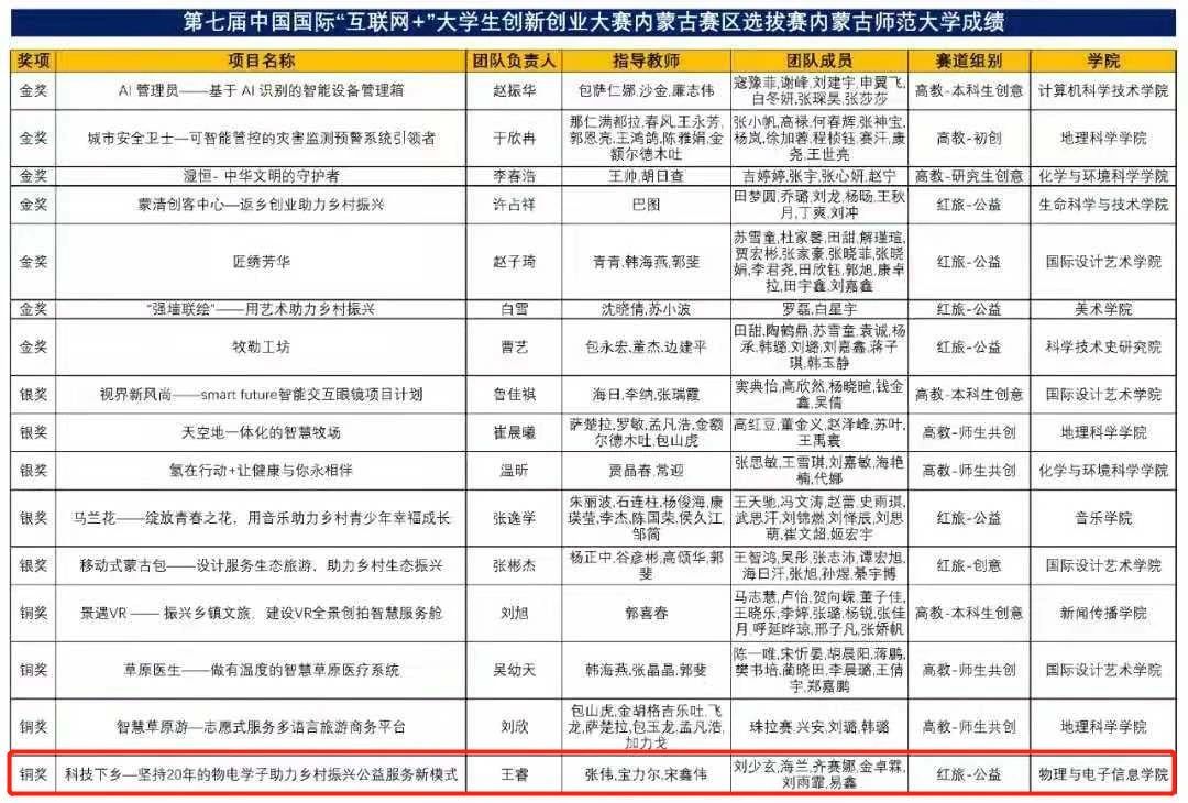 “科技下乡---坚持20年的物电学子助力乡村振兴公益服务新模式”项目在第七届内蒙古自治区“互联网+”大学生创新创业大赛暨第七届中国国际“互联网+”大学生创新创业大赛中夺得了铜奖的好成绩,项目围绕物电院二十余载助力乡村振兴、践行时代精神的志愿故事所展开。