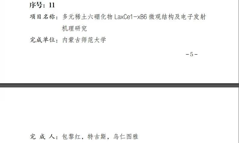 教师包黎红、特古斯、乌仁图雅申报的多元稀土六硼化物 LaxCe1-xB6微观结构及电子发射机理研究项目,荣获2019年度自治区科学技术自然科学奖三等奖。