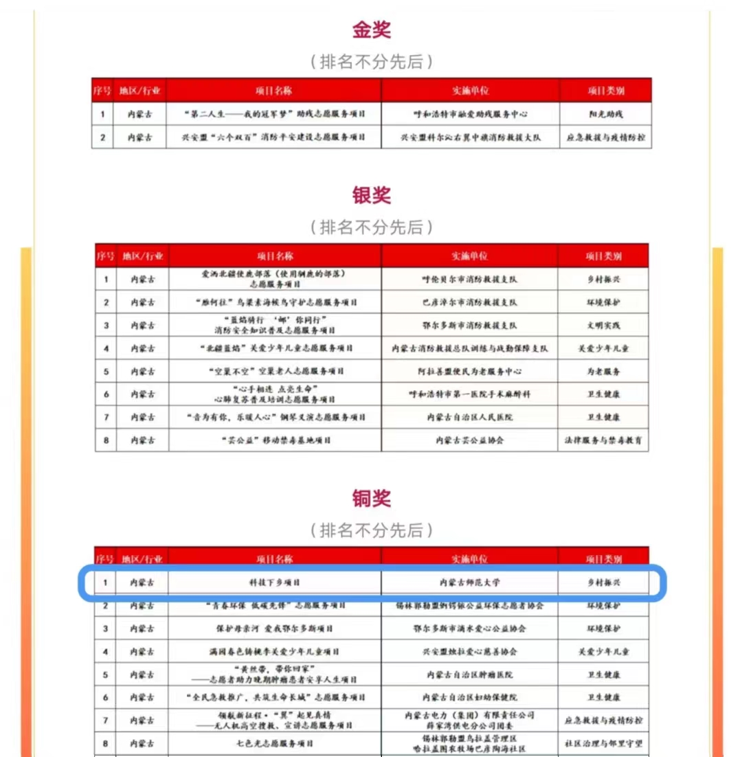 内蒙古自治区入围全国赛终评项目20个,参加线上路演答辩项目10个。经过评审,“第二人生——我的冠军梦”助残志愿服务项目、兴安盟“六个双百”消防平安建设志愿服务项目获得金奖;爱洒北疆使鹿部落(使用驯鹿的部落)志愿服务项目等8个项目获得银奖;熟女直播