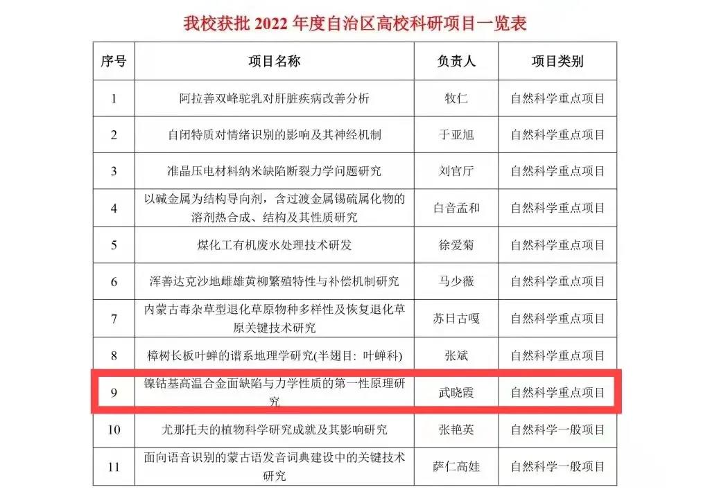 学院党委副书记兼副院长张伟《“五个认同”视域下的内蒙古高校大学生中华民族共同体意识教育研究》思政专项;武晓霞博士《镍钴基高温合金面缺陷与力学性质的第一性原理研究》自然科学重点项目。李卫博士“新能源储能材料工程研究中心”(自治区高校工程研究中心)培育建设。