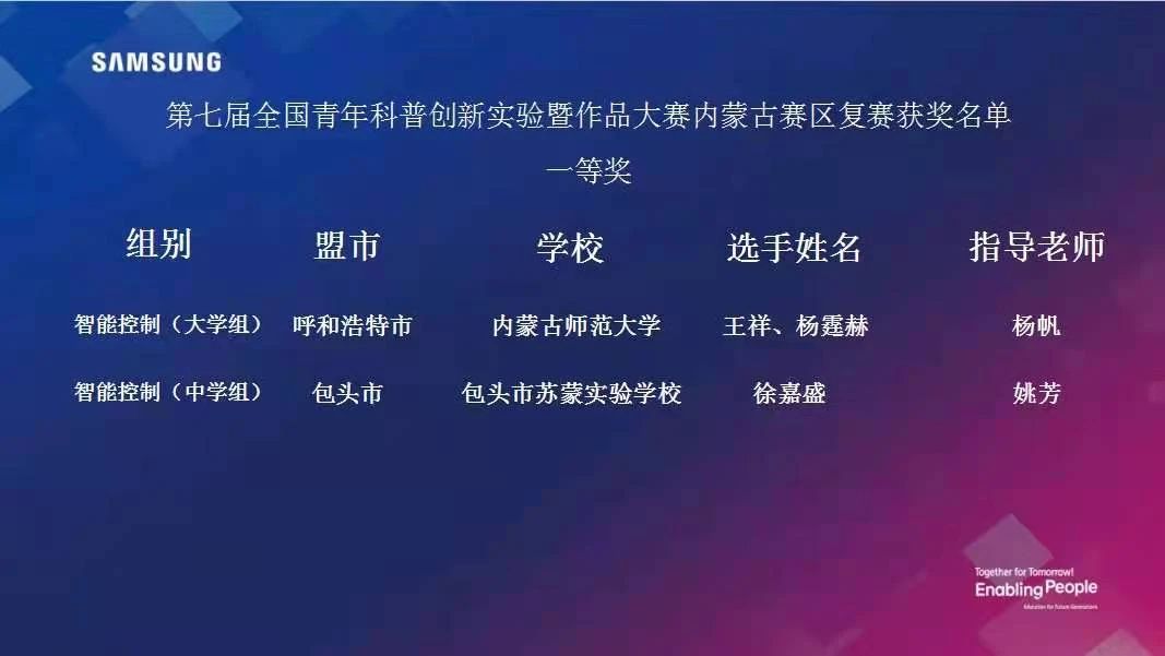 杨帆副教授指导,2019级电子信息工程1班本科生王祥、杨霆赫负责的《基于外骨骼的智能机械手 》作品,获得智能控制(大学组)一等奖(第一名),他们将代表内蒙古赛区参加6月举行的全国总决赛。