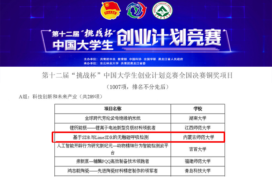 杨帆老师指导的“基于SDR与LimeSDR的无触碰呼吸检测”项目获第十二届“挑战杯”中国大学生创业计划竞赛全国决赛“科技创新和未来产业组”铜奖项目,这是熟女直播