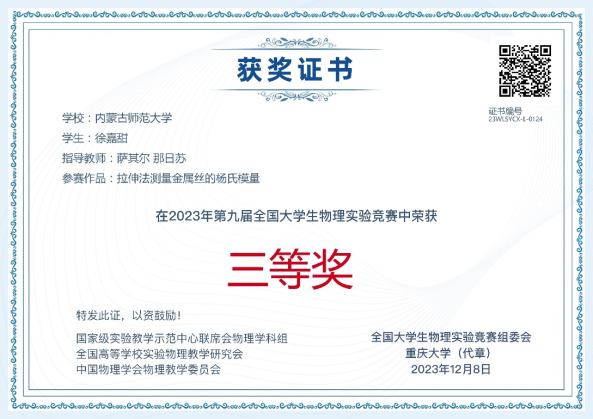 “拉伸法测量金属丝的杨氏模量”荣获讲课类作品三等奖,参赛同学徐嘉甜,萨其尔、那日苏老师指导。