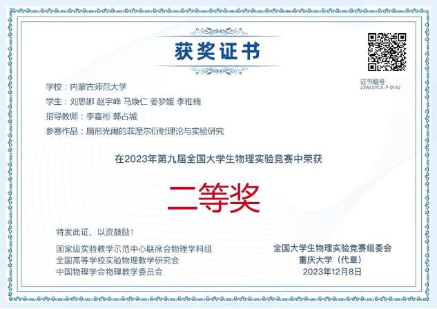 推荐作品“扇形光阑的菲涅尔衍射理论与实验研究”荣获命题类作品二等奖,团队由刘思娜、赵宇峰、马焕仁、姜梦媛、李雅楠组成,李喜彬、郭占城老师指导。
