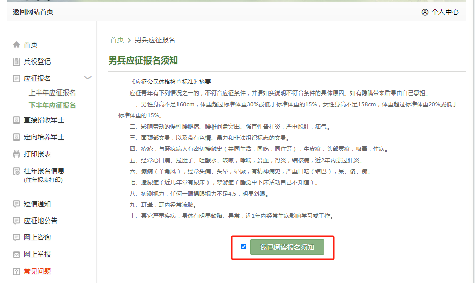 选择报名阶段确定后,会弹出男兵应征报名须知,请仔细阅读对照自身条件是否符合。