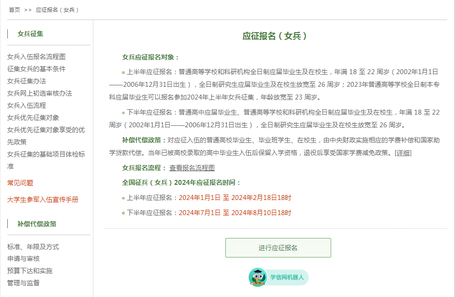 点击应征报名(女兵)按钮,弹出页面如下,左侧也有一些关于女兵征集的政策,大家可点开查看。