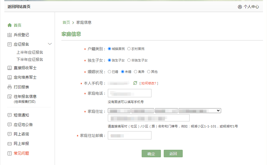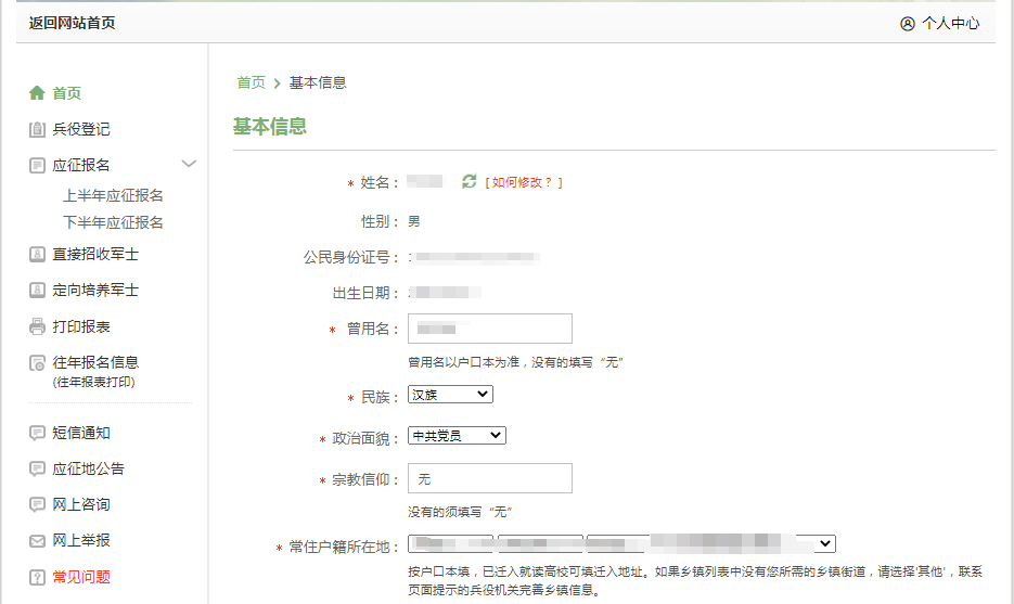 ①兵役登记和报名信息修改: