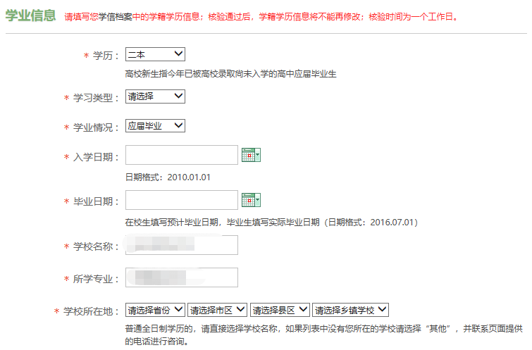 ●学业信息:填写学信网学生档案中的学籍学历信息,如果对学籍信息有疑问,请登录学信网查看确认如果学业信息审核不通过,请咨询学校或武装部修改。核验通过后将不能更改,核验时间为一个工作日。