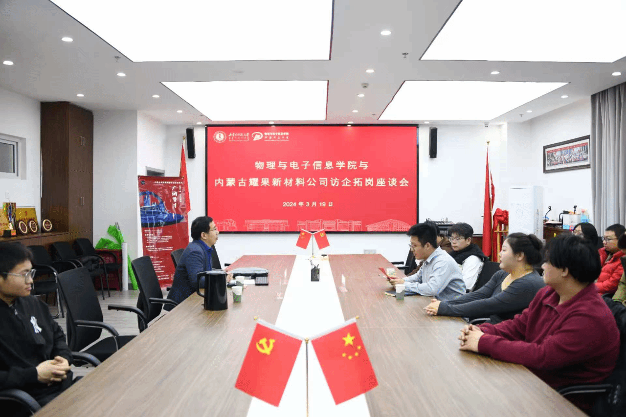与内蒙古耀果新材料有限责任公司在理工楼A座举行访企拓岗座谈会暨专场招聘宣讲活动。学院党委副书记欧志强、辅导员冀锦涛与内蒙古耀果新材料科技有限责任公司高耀昌一行人进行洽谈交流,2025届材料物理专业毕业生参加活动。