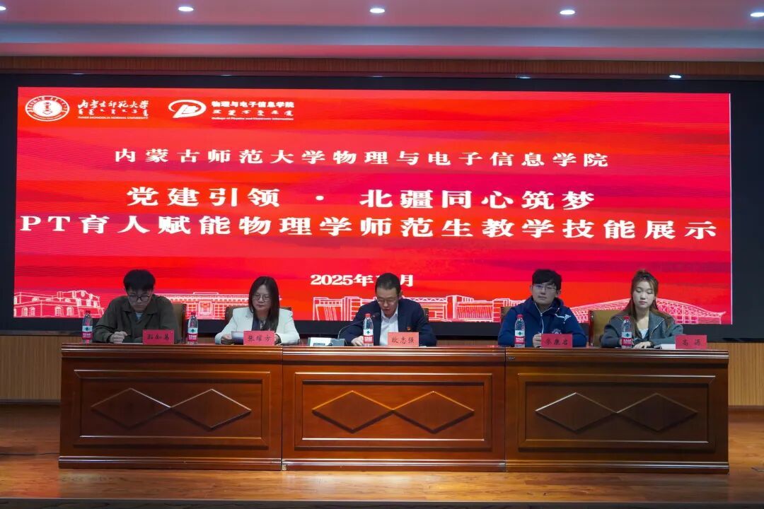 主办的“党建引领,北疆同心筑梦——PT育人赋能物理学师范生教学技能展示”活动在盛乐校区图书馆一楼学术报告厅举行。活动特邀南开大学物理科学学院思辨社团队进行交流分享,并同期举行了“融铸师魂·PT育人物理同心社”成立仪式。党委副书记、副院长欧志强,副院长张耀方、学院教师代表以及师范专业本硕学生参加。会议由副院长张耀方主持。