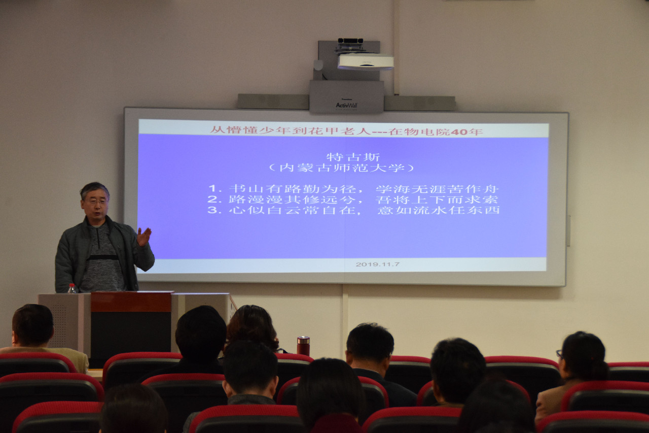 特古斯教授担任本次主讲人,以“从懵懂少年到花甲老人—在物电院40年”为题,讲述了一个草原孩子走向世界的故事、一个师大人成功的故事。活动由学院党总支书记刘美玲主持,熟女直播