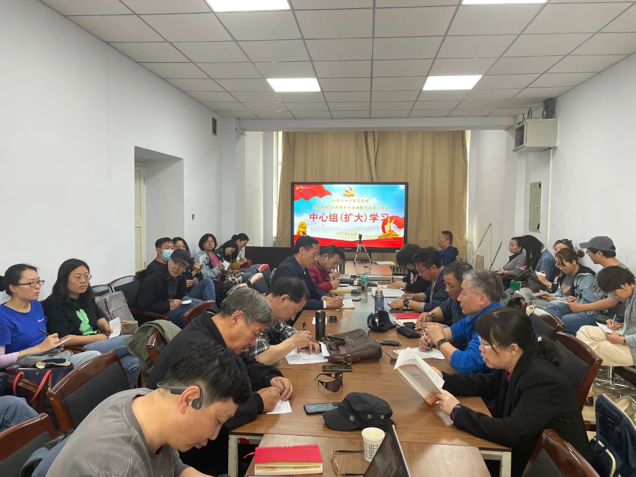 党委于赛罕校区会议室召开党史学习教育中心组(扩大)学习会议。学院党委书记刘美玲,副院长曹永军,副书记兼副院长张伟,副院长那日苏出席,学院环节干部,各系、部、室负责人,各党支部书记参加。会议由党委书记刘美玲主持。