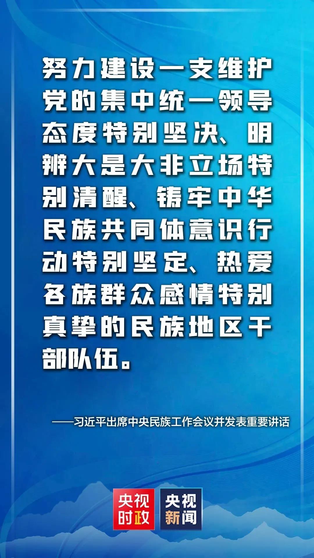 习近平指出,加强和完善党的全面领导,是做好新时代党的民族工作的根本政治保证。各级党委要增强“四个意识”、坚定“四个自信”、做到“两个维护”,不断提高政治判断力、政治领悟力、政治执行力,牢记“国之大者”,认真履行主体责任,把党的领导贯穿民族工作全过程,形成党委统一领导、政府依法管理、统战部门牵头协调、民族工作部门履职尽责、各部门通力合作、全社会共同参与的新时代党的民族工作格局。要加强基层民族工作机构建设和民族工作力量,确保基层民族工作有效运转。要坚持新时代好干部标准,努力建设一支维护党的集中统一领导态度特别坚决、明辨大是大非立场特别清醒、铸牢中华民族共同体意识行动特别坚定、热爱各族群众感情特别真挚的民族地区干部队伍,确保各级领导权掌握在忠诚干净担当的干部手中。要更加重视、关心、爱护在条件艰苦地区工作的一线干部,吸引更多优秀人才。要重视培养和用好少数民族干部,对政治过硬、敢于担当的优秀少数民族干部要充分信任、委以重任。要加强民族地区基层政权建设,夯实基层基础,确保党的民族理论和民族政策到基层有人懂、民族工作在基层有人抓。