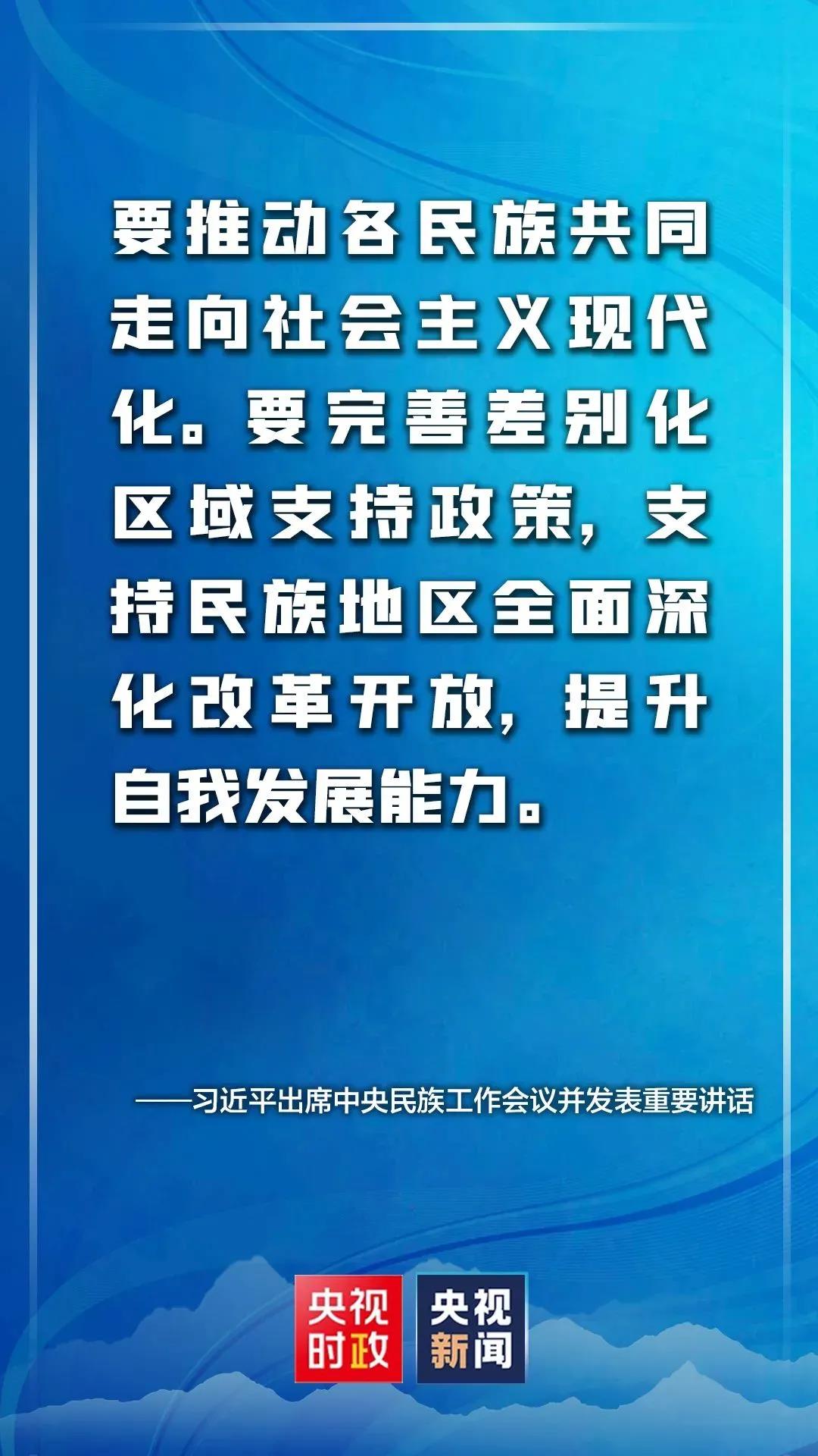 习近平指出,要推动各民族共同走向社会主义现代化。要完善差别化区域支持政策,支持民族地区全面深化改革开放,提升自我发展能力。民族地区要立足资源禀赋、发展条件、比较优势等实际,找准把握新发展阶段、贯彻新发展理念、融入新发展格局、实现高质量发展、促进共同富裕的切入点和发力点。要加大对民族地区基础设施建设、产业结构调整支持力度,优化经济社会发展和生态文明建设整体布局,不断增强各族群众获得感、幸福感、安全感。要支持民族地区实现巩固拓展脱贫攻坚成果同乡村振兴有效衔接,促进农牧业高质高效、乡村宜居宜业、农牧民富裕富足。要完善沿边开发开放政策体系,深入推进固边兴边富民行动。