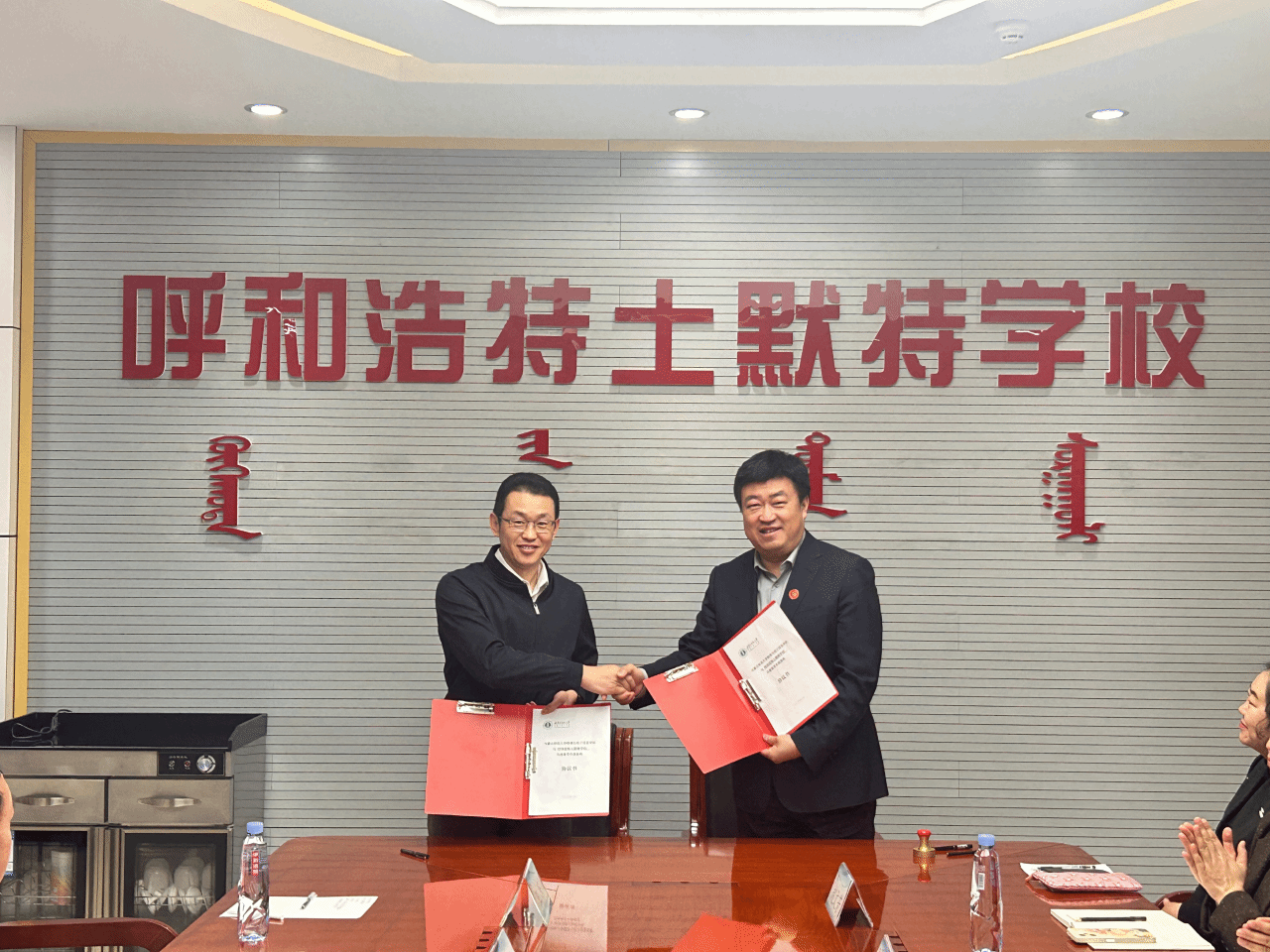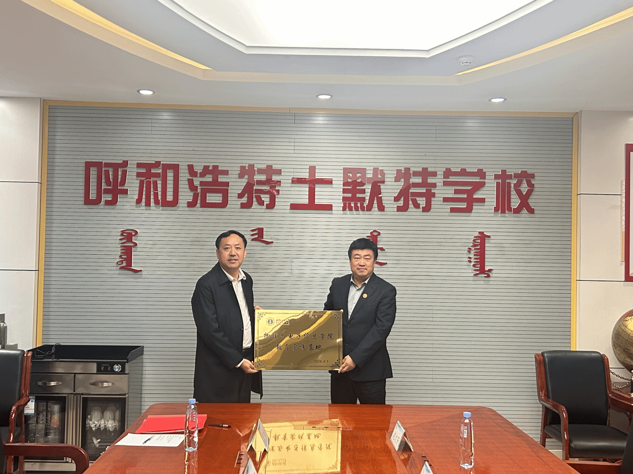 授予土默特学校“实践基地”牌匾,欧志强副书记代表学院与土默特学校签署合作协议。双方表示,未来将秉持资源共享、优势互补的原则,共商大学与中学一体化教育发展路径。