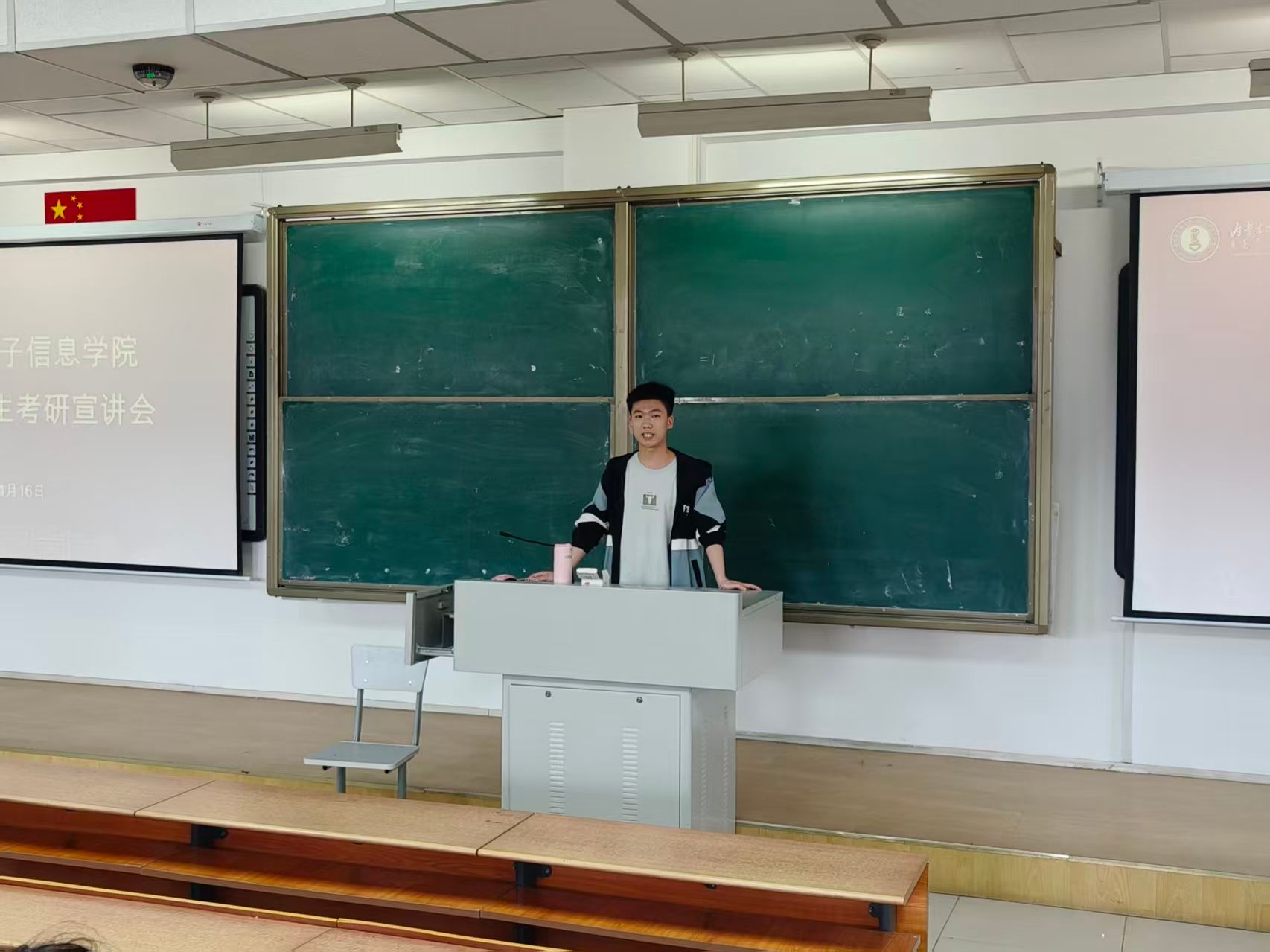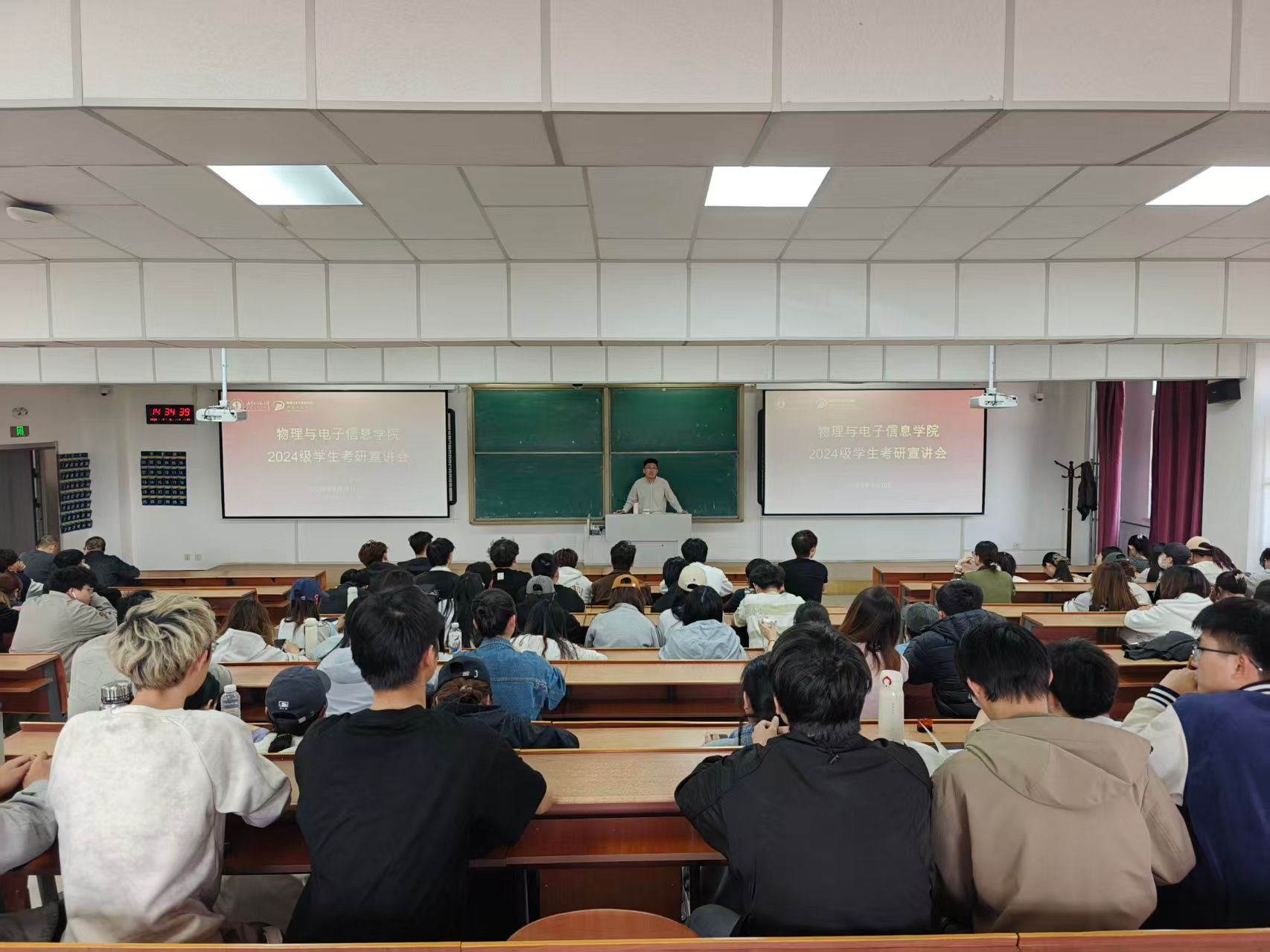在行知楼323教室举办2024级学生考研宣讲会。活动邀请了物理系王彦老师、蒋宁老师以及两位2022级优秀学生代表——考取河北工业大学的王子怡和考取内蒙古大学的贺欣蒙担任主讲。