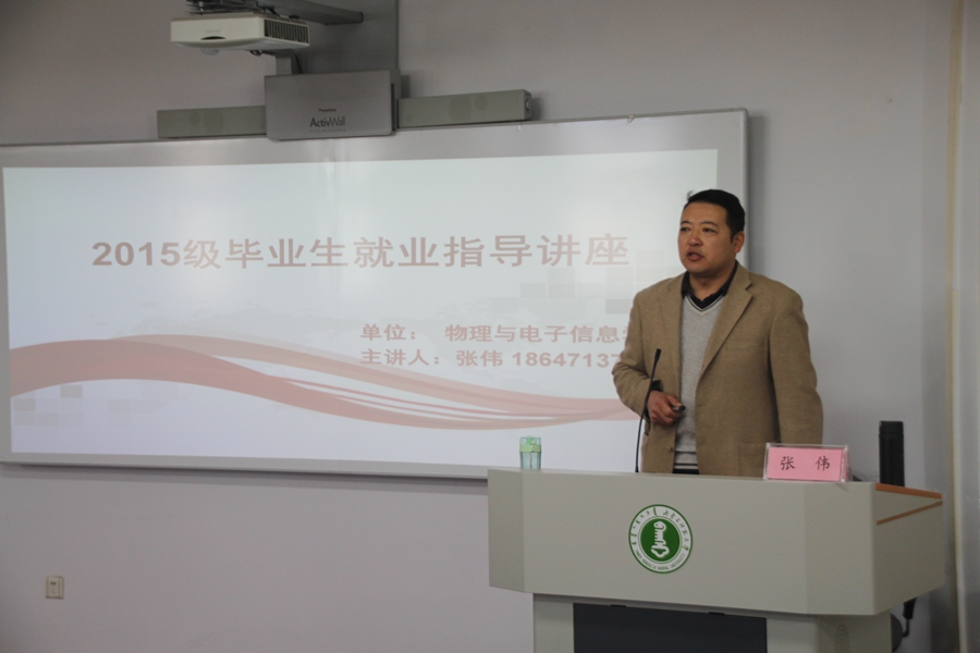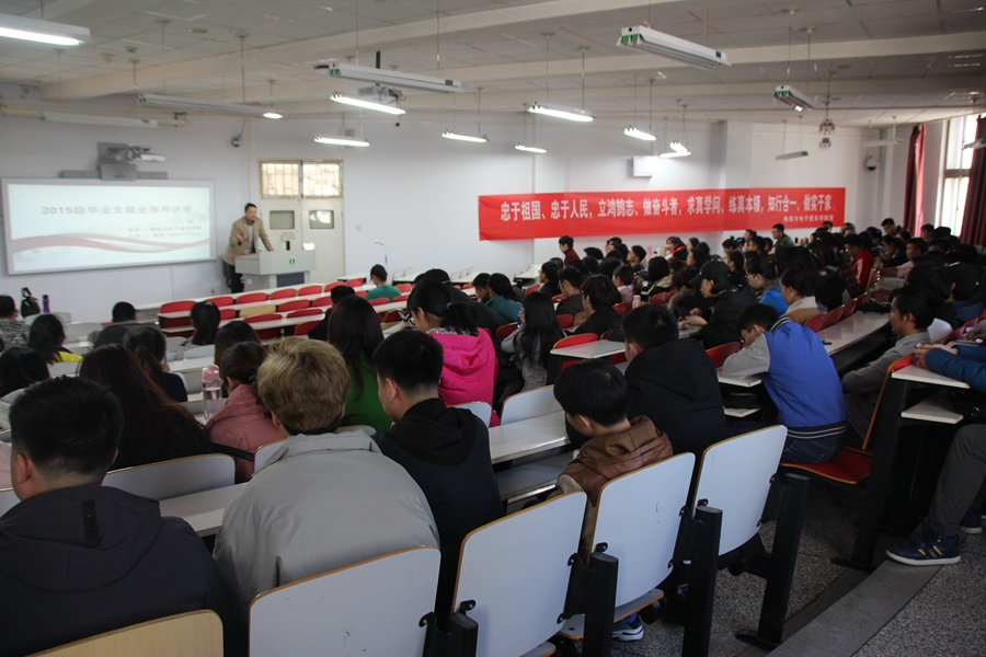党总支副书记兼副院长张伟为2015级毕业生做就业指导讲座,学工办木其尔与2015级学生参加讲座。