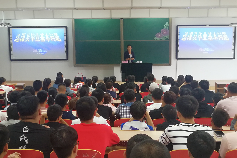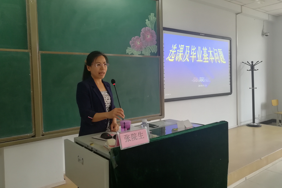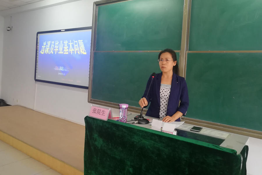 于行知楼225教室为2018级新生进行《选课及毕业基本问题》讲座,学院张院生老师担任主讲人。