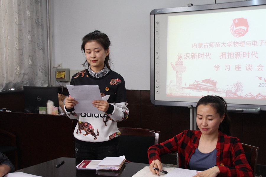 于物理楼会议室召开“认识新时代,拥抱新时代,耕耘新时代”学习座谈会,学习习近平总书记5月2日在北京大学师生员工座谈会上的讲话与李纪恒书记5月3日在内蒙古工业大学形势政策报告会上的报告精神。学院各班级团员代表共54人参加会议,学工办木其尔老师主持会议。
