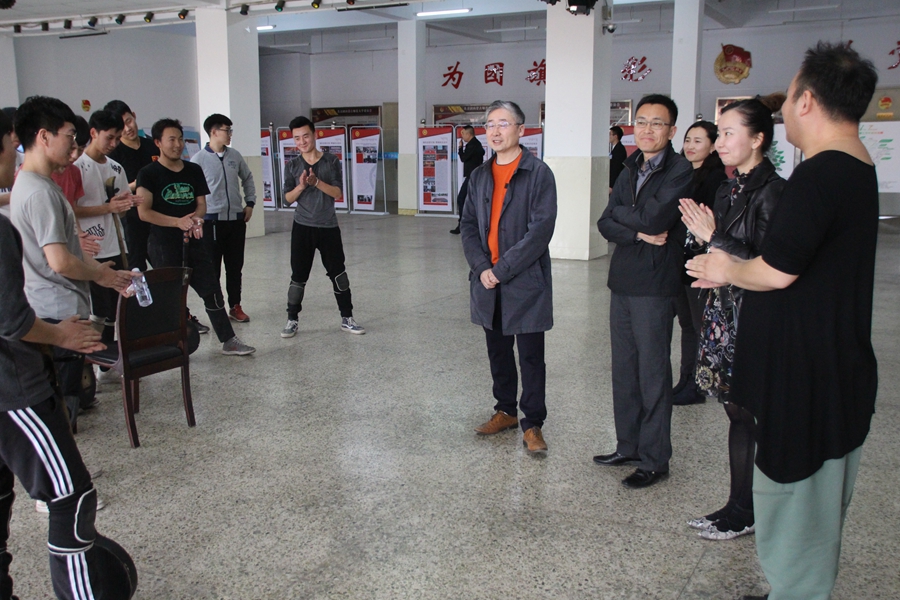 领导老师们到达排练室时,同学们正在紧锣密鼓地进行最后几次排练。老师们没有上前打扰,而是在一边观赏他们的舞蹈。排练间隙,特院长和何老师进行动员讲话。首先,特院长对大家参加本次全国比赛的积极性表示肯定,他希望大家珍惜这次来之不易的机会,继续刻苦排练,紧绷神经。每位同学都要互帮互助,及时修正之前每一次演出中发现的不足,争取为我们物电院以及内师大赢得荣誉。特院长表示,《舞动的琴弦》一路走来经历了太多的艰辛,而这些酸甜苦辣都会成为他们未来美好的回忆,多年以后回想起来一定会怀念当年在排练室和舞台上度过的每分每秒。随后,何老师询问了参赛演员的后勤保障和安全工作,要求大家一定要把保证自身安全放在第一位,并告诉大家不要有过大的压力,学院会尽量满足大家精神和物质上的需求,让大家能没有后顾之忧、全心全意地奔赴赛场,并且感谢塔尼拉巴雅尔教练的指导与辛勤付出。