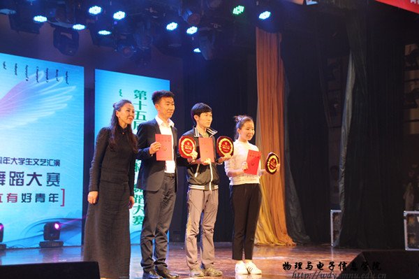 团总支书记萨其尔老师作为学院代表上台接过第十五届“百灵杯”舞蹈大赛二等奖奖牌与最具人气奖,并且萨老师与塔林托亚老师还获得优秀指导老师奖项。在晚会结束后,熟女直播