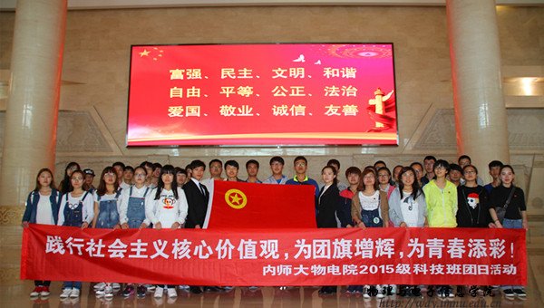 15级科技班团支部于本周在学院团总支书记萨其尔的带领下,到内蒙古博物院,结合“为团旗增辉,为青春添彩”的主题,一起回顾国家和民族的“发展足迹”,宣传了社会主义核心价值观关于“爱国”的相关内涵,结束后同学们自由讨论、提出意见,同时发表了自己对核心主义价值观的新的认识和看法。此次团日活动为同学们提供了一次对社会主义核心价值观深入学习与交流的机会。