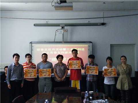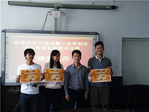 随后,举行颁奖仪式,阿梅书记、萨其尔老师、宋志强老师分别为获得优秀奖、最佳创意奖、“中国好室友”荣誉称号及五四拔河活动获奖同学及宿舍代表们颁奖,并亲切与获奖同学合影留念。