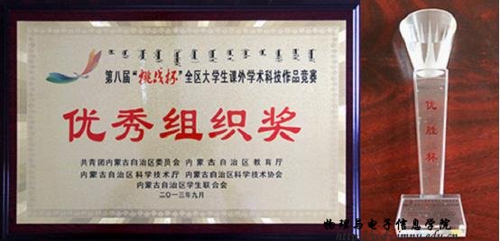 由自治区团委、教育厅、科技厅、科协、学联主办的第八届“挑战杯”全区大学生课外学术科技作品竞赛闭幕式晚会暨颁奖典礼于9月15日在内蒙古工业大学落下帷幕。我校以自治区高校第四名的成绩获得本届“挑战杯”竞赛“优胜杯”及“优秀组织奖”。校党委副书记格日乐图、团委书记斯钦参加开幕式并到现场观看了我校“挑战杯”优秀作品展。