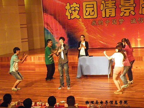 压轴登场,来自11级工程2班的鲁博、李丹阳,12级科技班的王诗莹、苏丽芳,12级工程1班的张蓝方,12级工程2班的马骁,12级工程3班的安鸿磊凭借着夸张的形态表演和诙谐的语言引得场下笑声不断。并用精彩用心的表演、绚丽的灯光和音效传达着“诚信”深刻涵义,给在场的观众与评委们留下了深刻印象。经过激烈的角逐和公正的评判,熟女直播