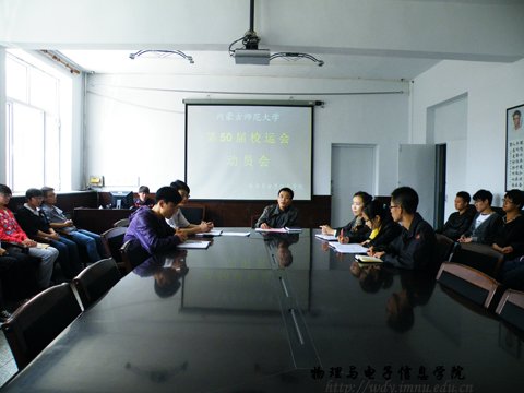 领导在物电院一楼会议室召开了第五十届学校运动会动员会,全院上下高度重视此次校运会,加大资金投入,由学院学工组全体老师负责开展训练参赛事宜。参加此次动员大会的领导有学院党总支副书记何小龙老师,学工办王伟老师、团总支萨其尔老师以及入选院队的所有运动员。