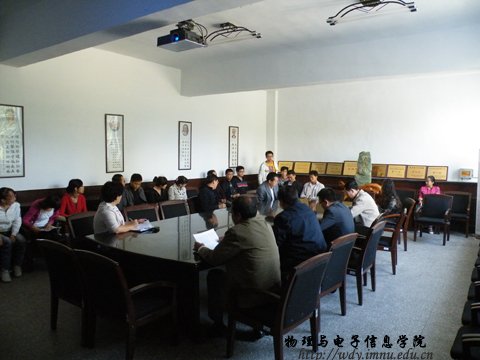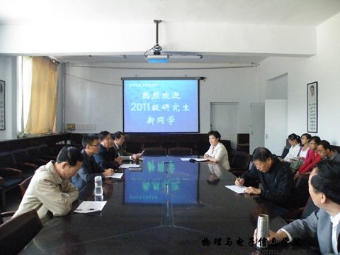 在物理楼会议室召开了2011级研究生见面会,参加见面会的领导老师有院长张伟老师,党总支书记阿梅老师,副院长吉日嘎拉老师,党总支副书记何小龙老师,以及松林、杨立森、赵凤歧、李瑞芳、曹永军五位研究生导师。