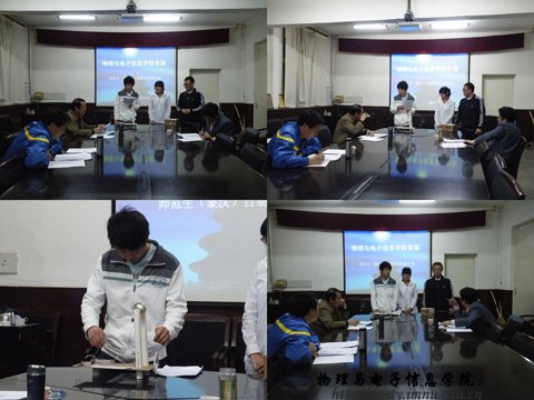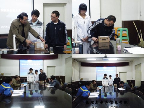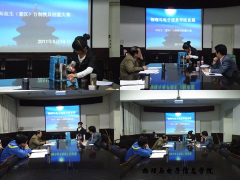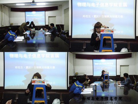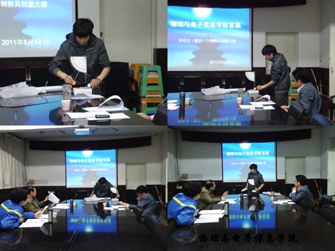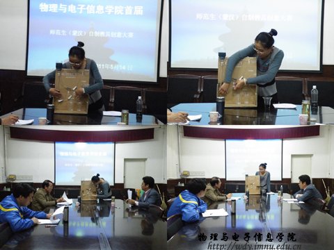 比赛前各位比赛选手都经过了精心的准备,比赛时同学们对自己作品的性能、用途、制作过程以及相对于以往教具的优越性进行了到位的解说,并认真回答了评委老师的提问。最后,获得一等奖的是:09物理学汉班的王新宇、盛春娇、包乌日娜共同制作的水流类比电流演示教具。获得二等奖的是:08物理学汉班吴昇、刘会新、吴志伟共同制作的黑箱子;08物理学汉班王聪制作的验证阿基米德原理的实验装置。获得三等奖的是:09物理学汉班杨惠制作的探究力对物体运动的影响演示教具;08物理学汉班刘会新、吴昇、吴志华共同制作的能量转化演示教具;08物理学蒙班国庆制作的“S”形动量守恒仪。