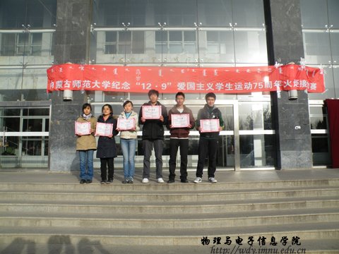 12月9日即“一二·九”学生爱国运动七十五周年之际,熟女直播 积极配合校学生会参加了于图书馆前举行的校园火炬接力赛。首先进行的是由五男五女组成的十人竞赛组,并且取得了团体总分第三的好成绩。随后参加了由三男三女组成的学生会趣味组。