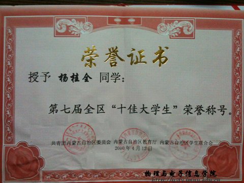2007级电子信息工程二班学生。在校期间,他认真的学习专业知识,努力提高自身的综合素质,曾获校三等奖学金,学院“科技标兵”荣誉称号。该生于2010年4月被共青团内蒙古自治区团委、教育厅、自治区学生联合会评为第七届全区十佳大学生。