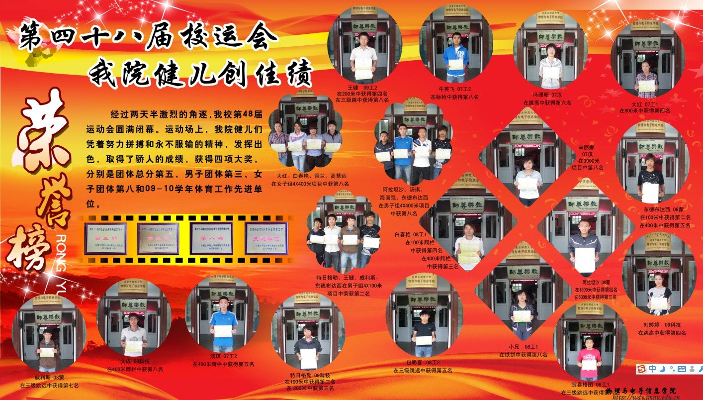 健儿们凭着努力拼搏和永不服输的精神,发挥出色,取得了骄人的成绩,获得四项大奖,分别是团体总分第五、女子团体第八、男子团体第三和09-10学年体育工作先进单位。