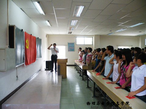 大会在庄严的《国歌》声中开始,176名新党员面向党旗肃立,表达了对中国共产党的崇高敬意。全体新党员面对党旗庄严宣誓,表达了自己将认真履行党员义务以及为共产主义奋斗终身的决心!随后,老党员为新党发放了中国共产党章程;07物理汉班隋文燕、07电子信息工程1班大红同志代表新老党员分别做了发言。