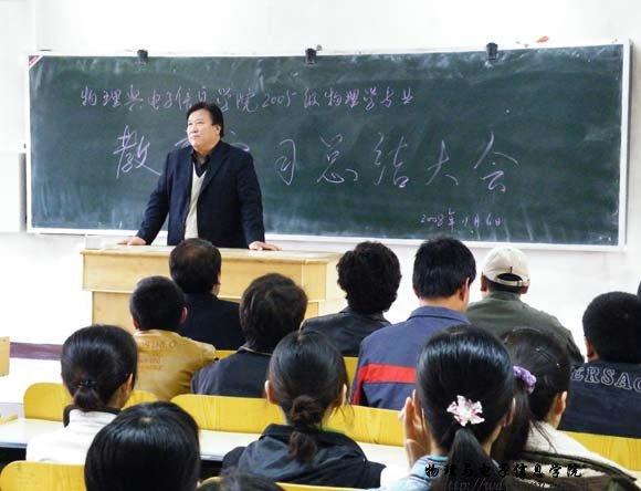 11月7日下午16;30,熟女直播 物理系05级学生的教育实习总结大会在信息楼三共举行。与会人员有阿梅书记,张伟院长,院长助理吉日嘎拉老师和张敏,曹永军等实习指导教师,以及物理系05级06级蒙汉班学生,教室座无虚席。
