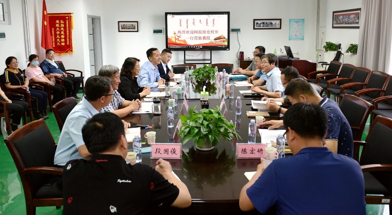 党委书记刘美玲、副院长曹永军、党委副书记兼副院长张伟、副院长那日苏、各系主任及教师代表参加本次调研会。党委书记刘美玲致欢迎辞,对阿校长一行莅临学院调研指导表示热烈的欢迎。曹永军副院长从学院发展情况、亮点成绩、存在问题以及工作思路四大方面向各位领导做了汇报,介绍了学院的基本情况、学科建设、专业建设、师资队伍建设、科学研究、学院目前面临的困难及今后的工作重点。