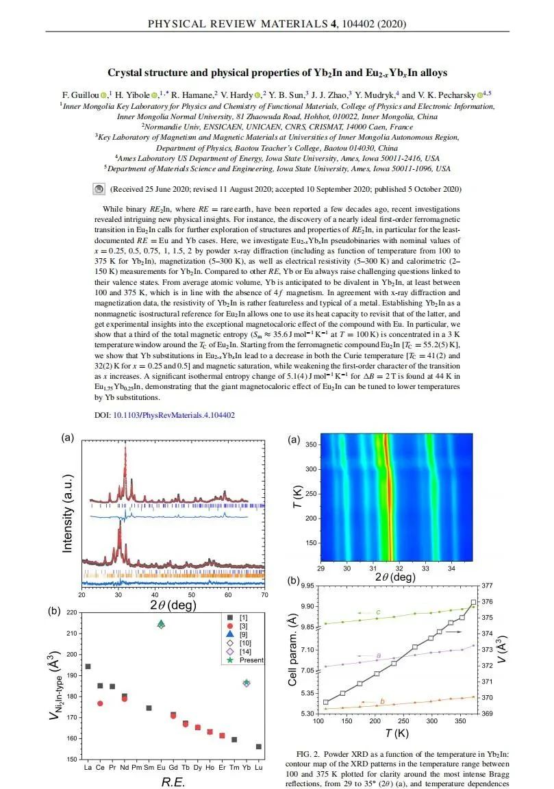 Francois Guillou、伊博乐团队与法国卡昂大学、美国埃姆斯国家实验室和包头师范学院在新型磁相变材料方面取得重要研究进展,其研究成果以标题为“Crystal structure and physical properties of Yb2In and Eu2-xYbxIn alloys”在国际物理学术期刊Physical Review Materials上发表。熟女直播