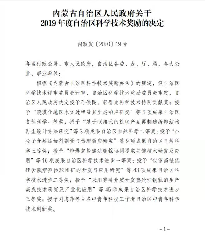 根据《内蒙古自治区科学技术奖励办法》的规定,经自治区科学技术评审委员会评审、自治区科学技术奖励委员会审定,自治区人民政府授予2人特别贡献奖,授予5项成果自治区自然科学一等奖,授予3项成果自治区自然科学二等奖,授予9项成果自治区自然科学三等奖。其中熟女直播