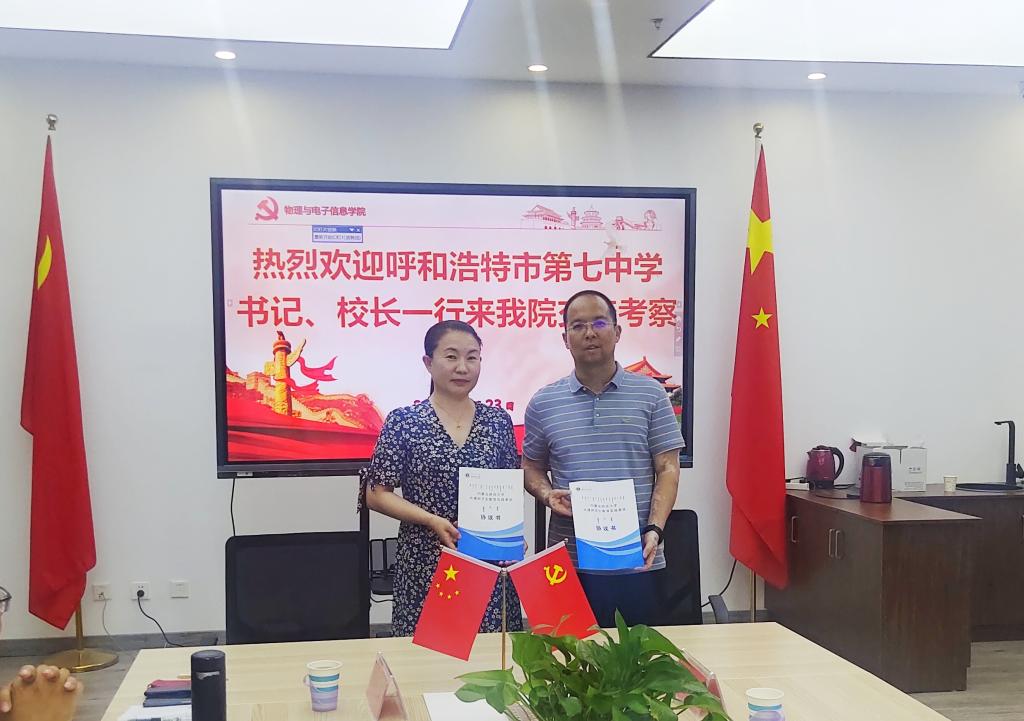 那日苏副院长主持。曹永军副院长和吴海鹰校长分别介绍了各自单位的基本状况;物理系副主任孙咏萍老师就学院近年来汉生班教育实习情况做了汇报与说明;教务处实践科负责人毕力根格日勒老师参会指导工作,并与七中校长签署了“共建师范生教育实践实习基地协议”。