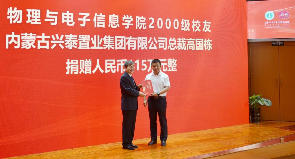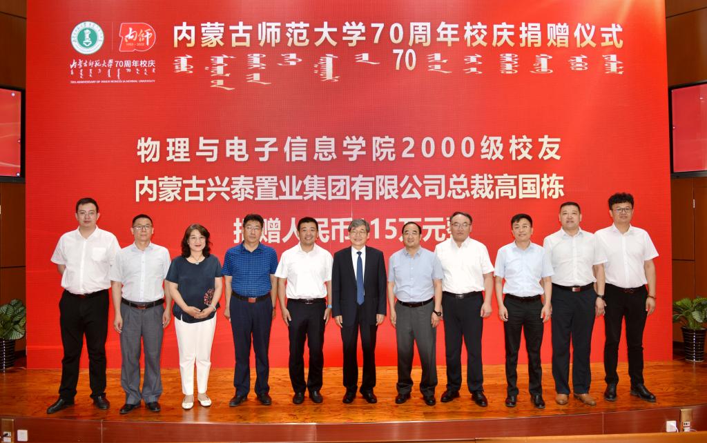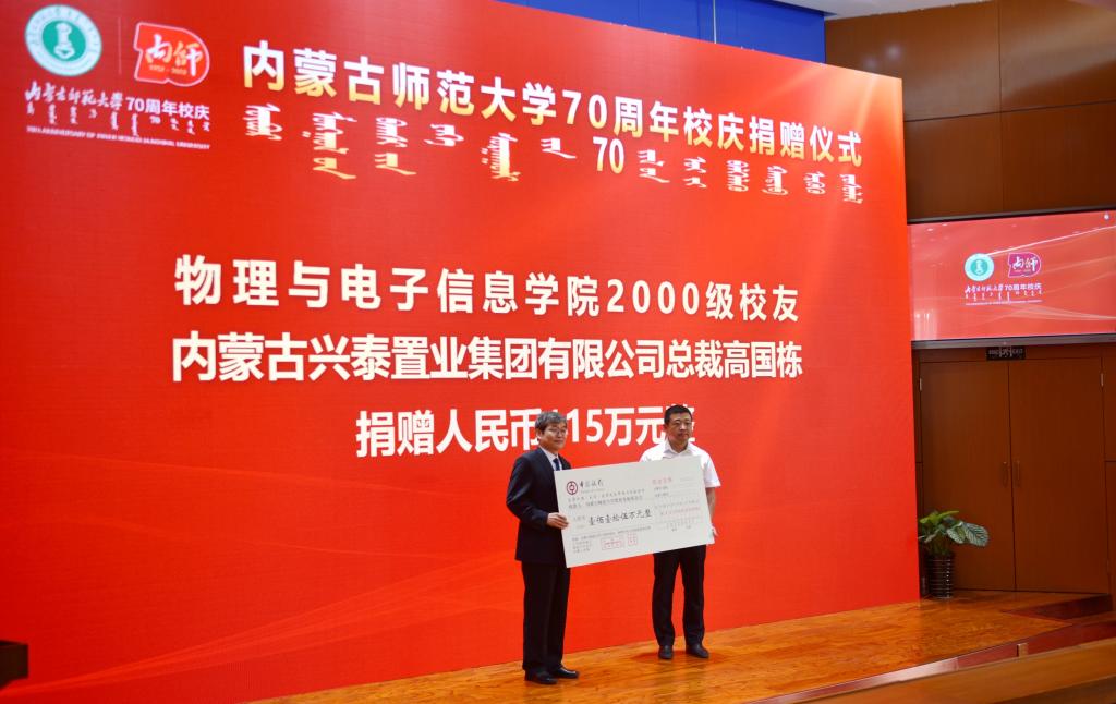 2000级校友、内蒙古兴泰置业集团有限公司总裁高国栋向学校捐赠115万元人民币,助力学校、学院基本建设、师生教育、就业创业、校友事业和相关性的教育发展。我校党委书记阿拉坦仓代表学校接受捐赠,并为捐赠者颁发捐赠证书。学校在家校领导,副处级以上干部及校庆办、校友会、基金会工作人员、以及各学院校庆联络员参加会议。会议由王来喜副校长主持。