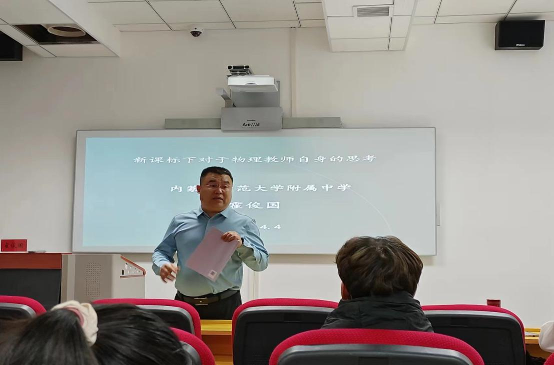 专业硕士实践导师霍俊国老师做题为“新课标下对于物理教师自身的思考”专题讲座。学院本硕学生、学科教学(物理)研究生导师聆听了本次报告会。