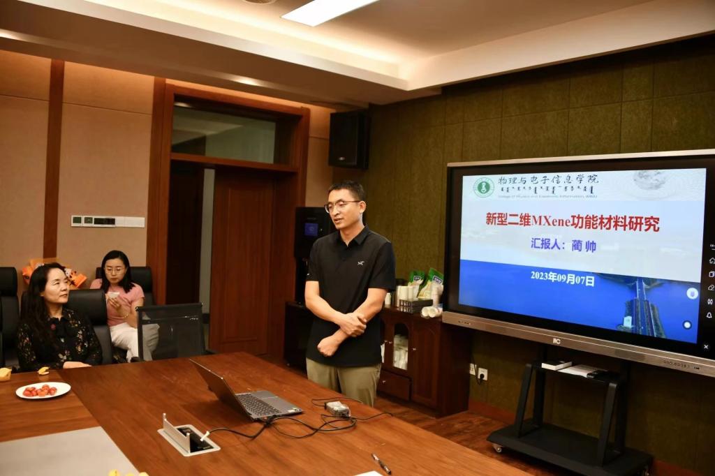 四位博士蔺帅、李卫、杨艳春、吕晓东做学术报告,并与在座师生进行了互动交流。学术报告主题分别为:《新型二维MXene功能材料研究》;《电池材料研究及储能技术开发》;《铜锌锡硫硒和铜钒硫硒薄膜太阳能电池的制备及优化》;《新型二维材料的理论设计及其物性调控》。四位新老博士各展其才,围绕各自研究领域,展示出最新研究成果以及未来研究方向。学术沙龙活动不仅加强了院内学术交流,凝练了研究方向,整合了学术团队,也助推了一流学科建设研,助力学院科研工作再上新台阶。与会教师针对物理学一级学科博士点建设进行了研讨。最后,云国宏教授讲话,对学院近年来取得的发展成就给予高度评价,并对学院高水平师资队伍建设,优势项目培育,博士点学科建设,科研平台建设以及产出高水平成果等方面如何更好发展提出了建议。