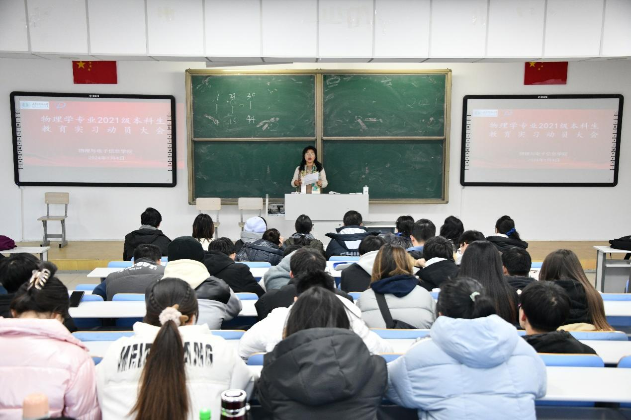 在行知楼118召开物理学专业2021级本科生教育实习动员大会。学院副院长包黎红、负责2024年实习的校内指导老师出席会议,2021级物理学专业全部在校生参加会议,会议由物理系副主任孙咏萍主持。