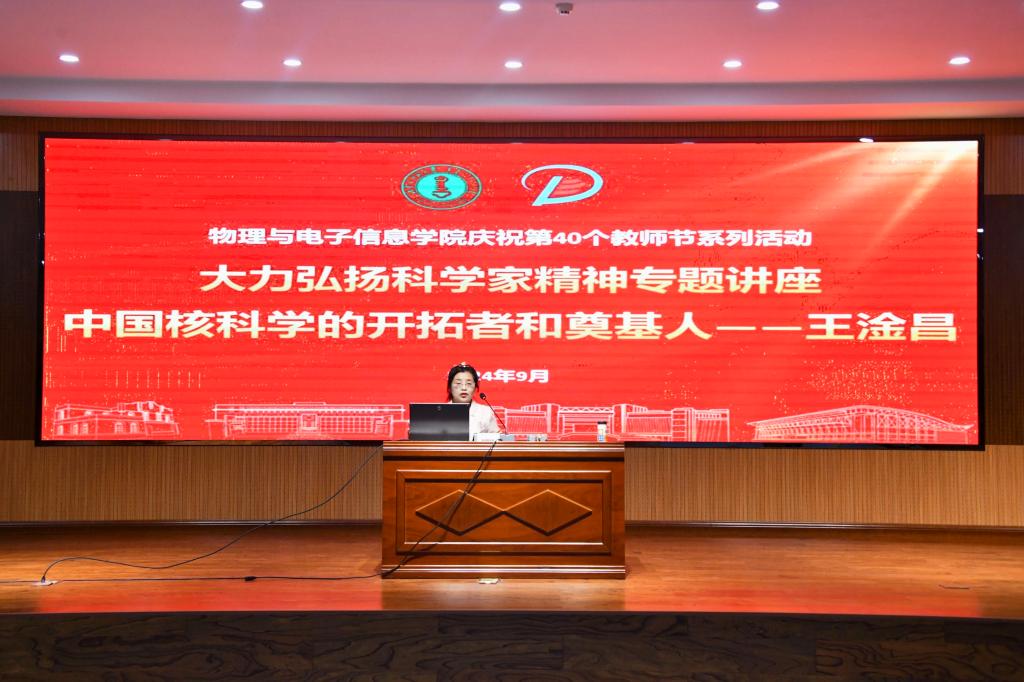 孙咏萍教授以“中国核科学的开拓者和奠基人——王淦昌”为题,从相关背景知识出发,结合自身经历帮助同学们厘清科学精神的概念,随后通过丰富的历史资料和珍贵的影像记录,全面而深入地讲述了王淦昌先生为中国核武器事业所作出的杰出贡献。为大家讲述了王淦昌先生的科学家精神,他坚韧不拔、勇于探索、严谨求实、无私奉献的精神风貌,不仅激励了一代又一代的科研工作者,也成为了全社会共同尊崇和学习的楷模。最后,孙咏萍教授以“爱国、创新、求实、奉献、协同、育人”的科学家精神结束了本次讲座。