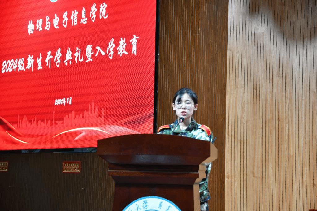 新生代表2024级物理学1班蔡馨同学发言。她代表2024级全体新生感谢老师的谆谆教导及父母的悉心陪伴,并表达了对于即将开启的新征程的热切期盼及对于大学生活的思考和规划。