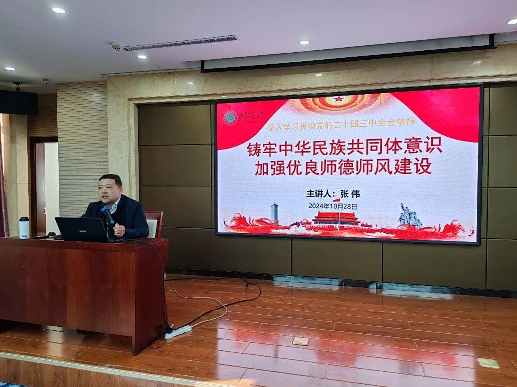 党委书记张伟,以“铸牢中华民族共同体意识,加强优良师德师风建设”为题,围绕“统一思想认识,夯实铸牢中华民族共同体意识的思想基础;追寻总书记足迹,汇聚铸牢中华民族共同体磅礴伟力;加强师德师风建设,提升教师职业素养”三方面进行了深度讲解,引导学员们牢牢抓住筑牢中华民族共同体意识这条主线,深化民族团结进步教育。