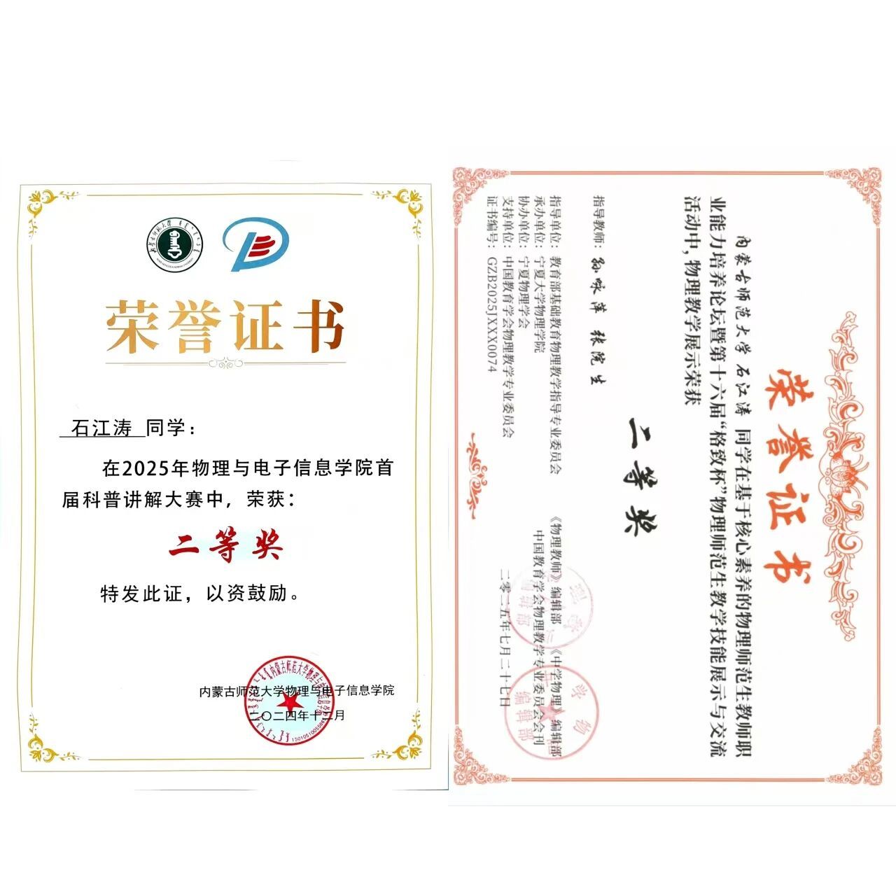 2024级学硕班 共青团员 获得2025年内蒙古自然科学学术年会物理分会暨内蒙古自治区物理学会年会优秀论文一等奖